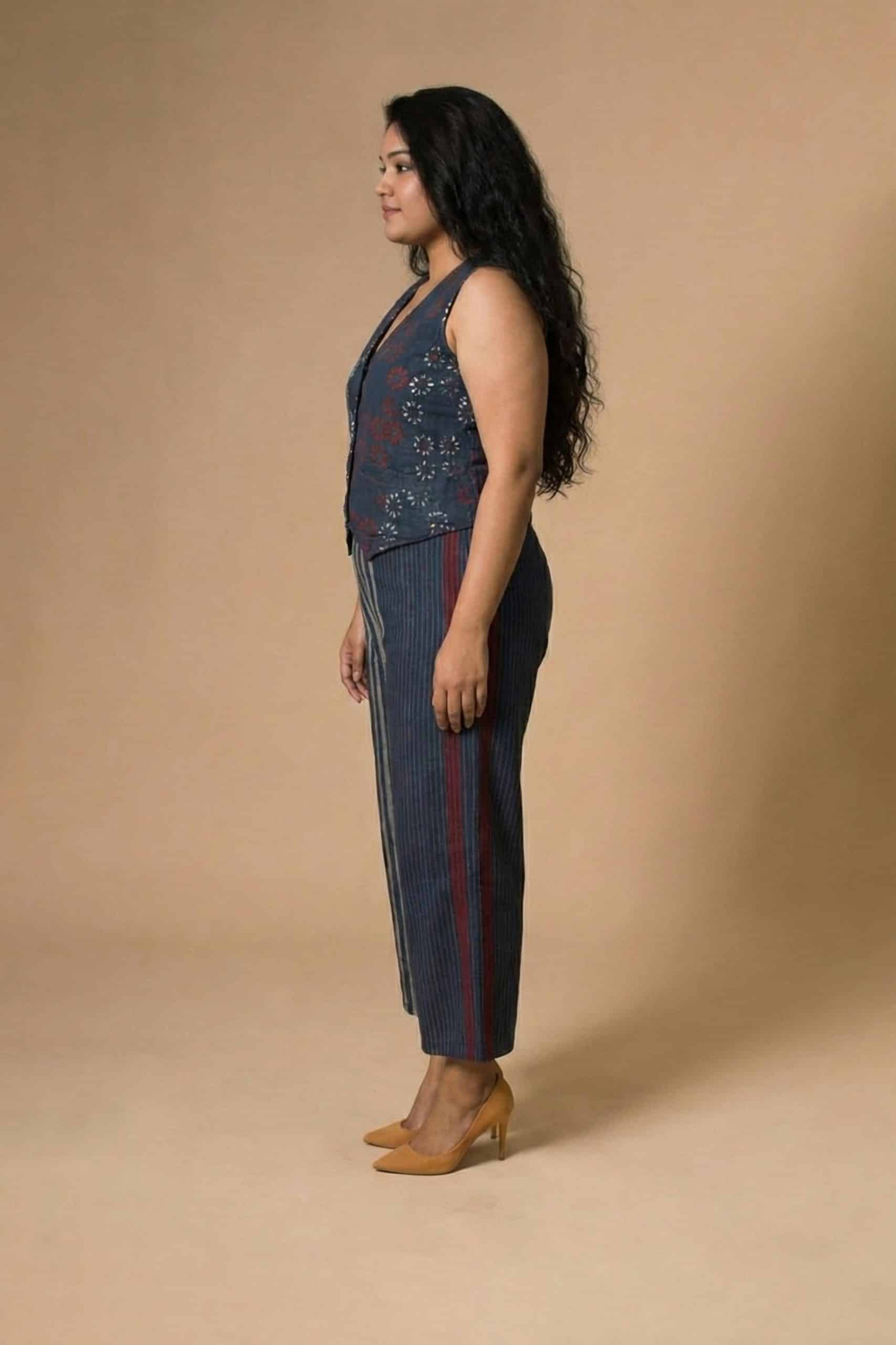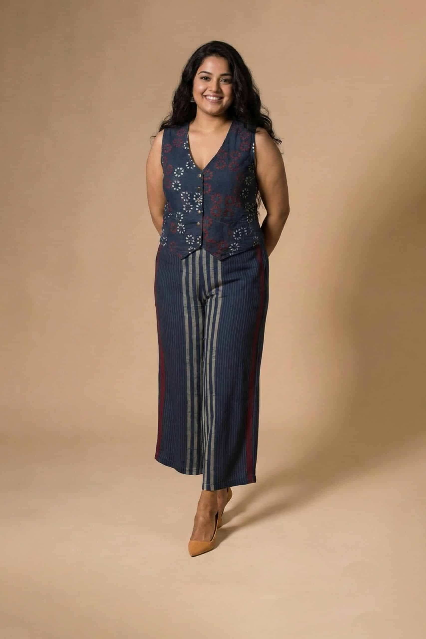 The Ajrakh Vest and Palazzo Set brings together comfort, beauty, and traditional charm. It includes a sleeveless floral vest and a long striped skirt made from soft handwoven cotton. The vest has wooden buttons and a flattering V-neck, while the skirt flows naturally and creates a graceful shape.