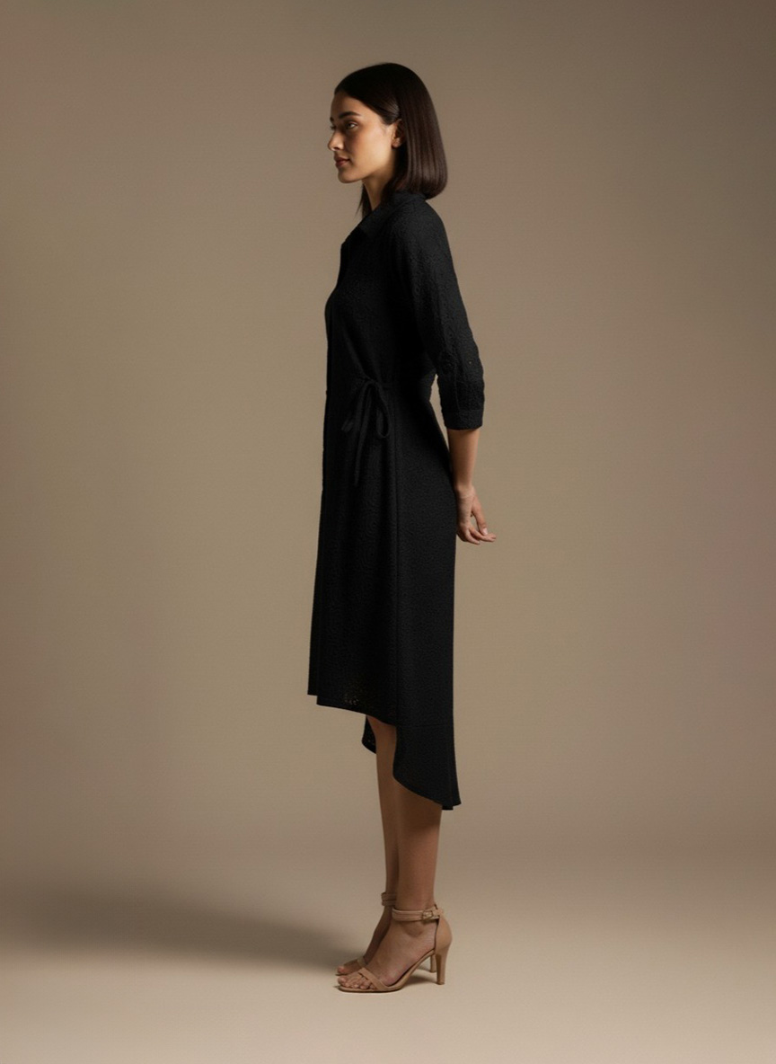 The Black Cotton Shirt Dress blends classic style with modern comfort. Crafted from breathable cotton eyelet fabric, it feels soft on the skin and keeps you comfortable all day long. The elegant black hue makes it a timeless choice for work, travel, and weekend outings.