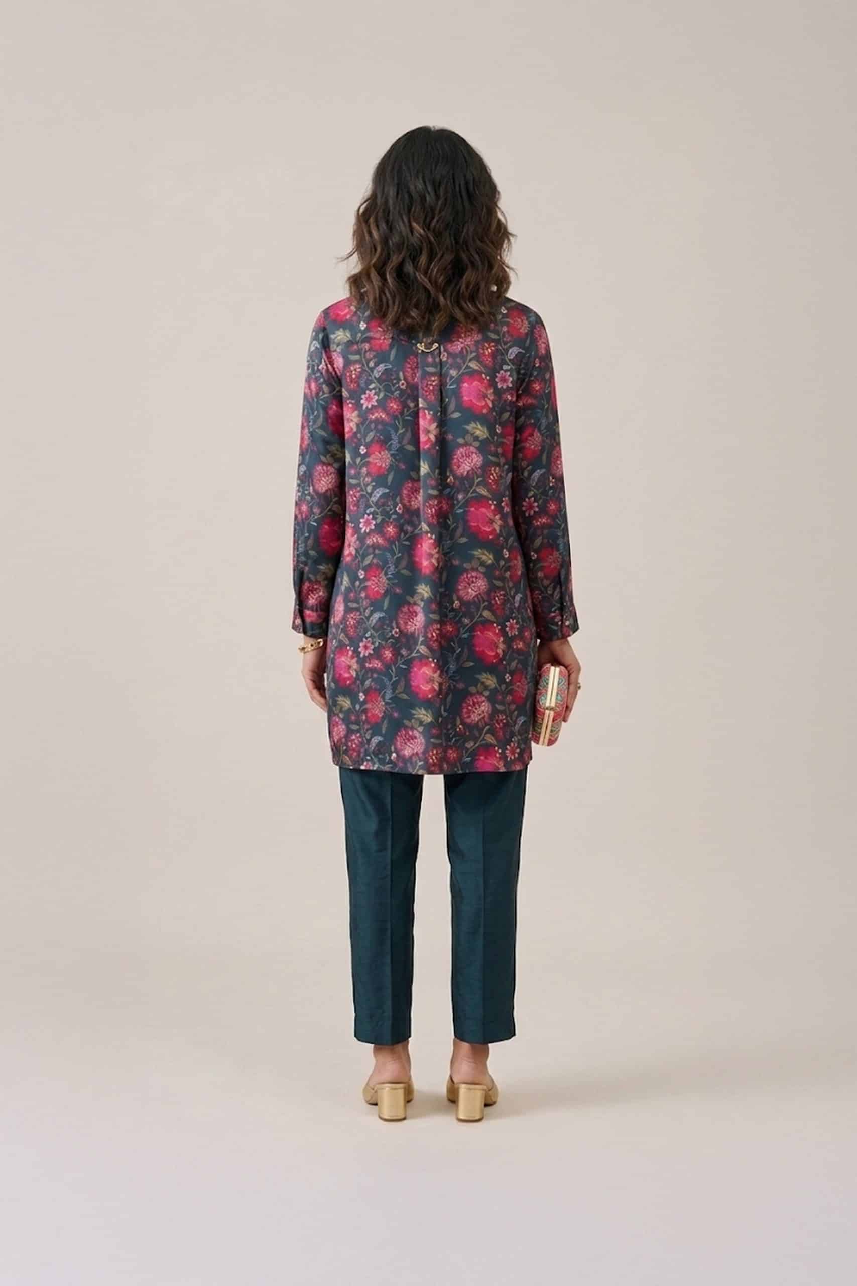 Furthermore, the lightweight fabric makes this Dark Floral Kurta Set comfortable for long hours. At the same time, the tailored fit of the pants adds structure and refinement to the overall look. As a result, this outfit becomes a must-have addition to your wardrobe.