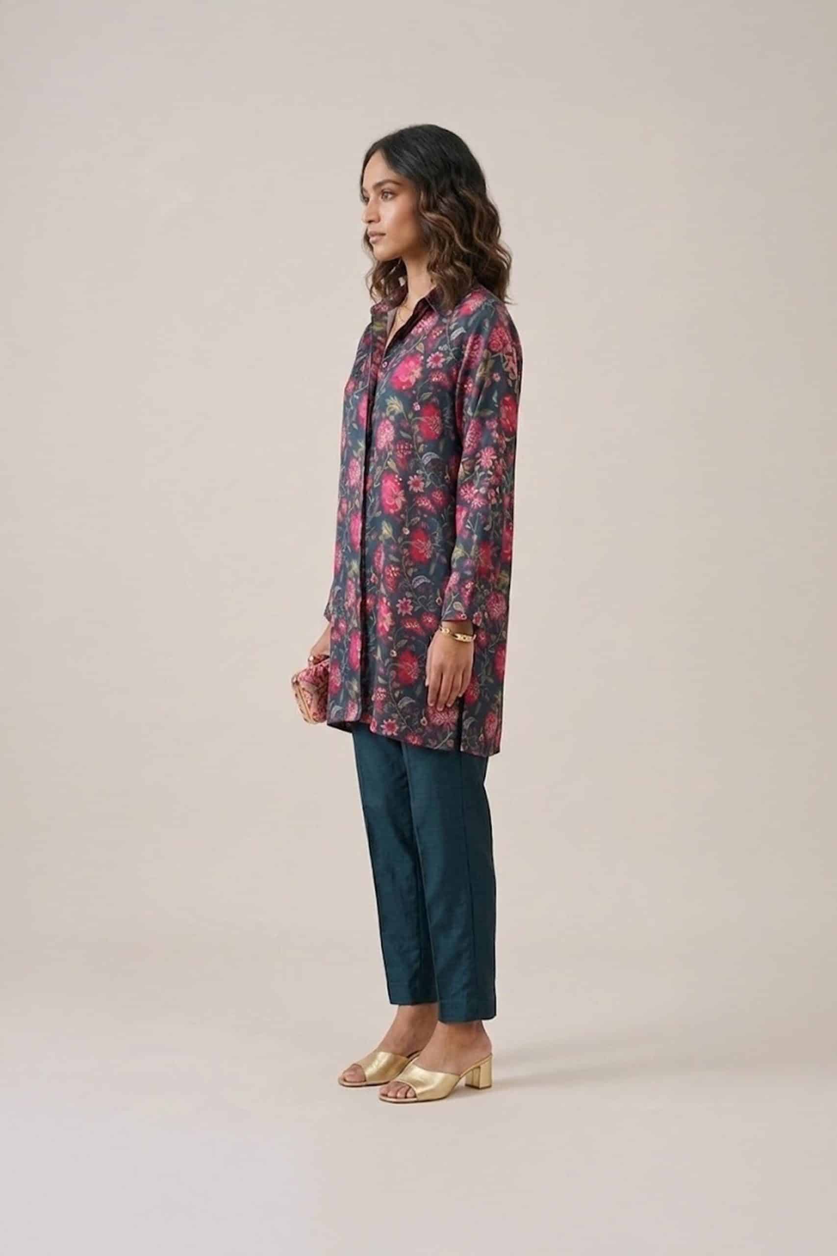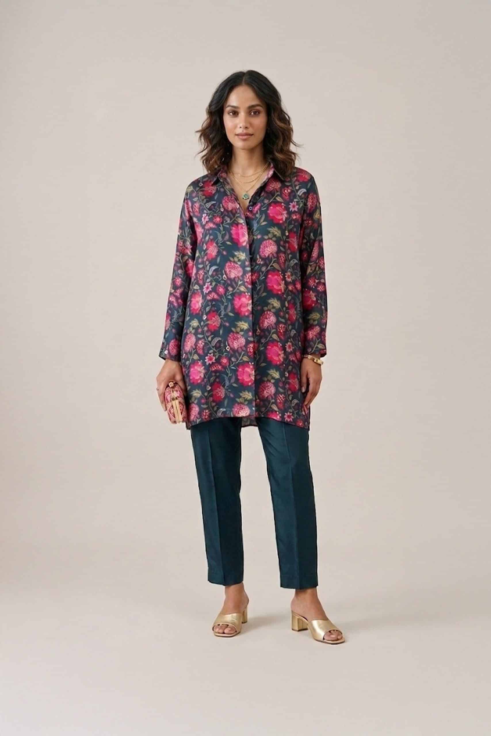In addition, the Dark Floral Kurta Set is highly versatile and easy to style. You can pair it with minimal accessories for a casual daytime look. Alternatively, you can elevate it with statement jewelry and heels for festive occasions. Because of its elegant design, this outfit transitions effortlessly from day to evening wear.