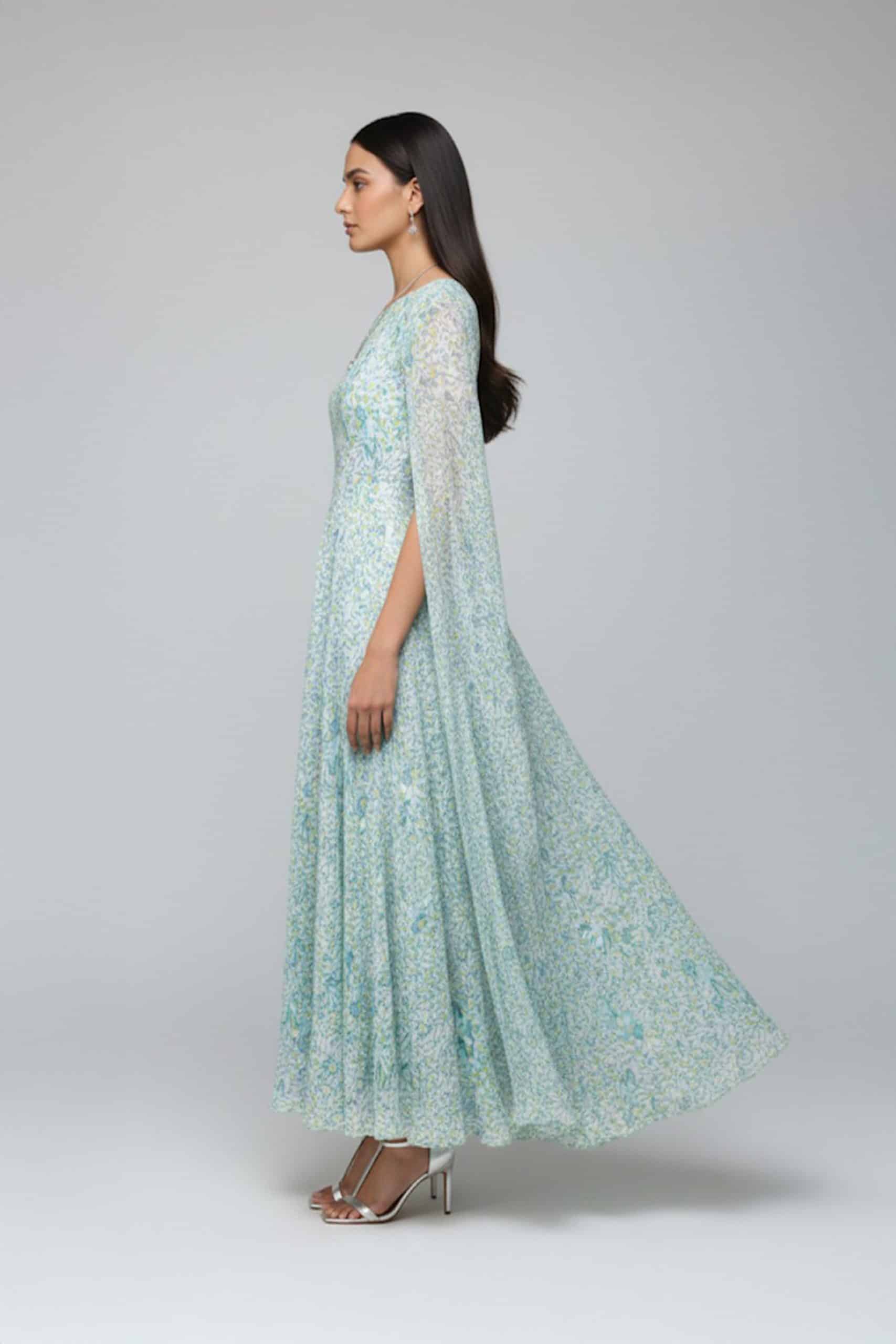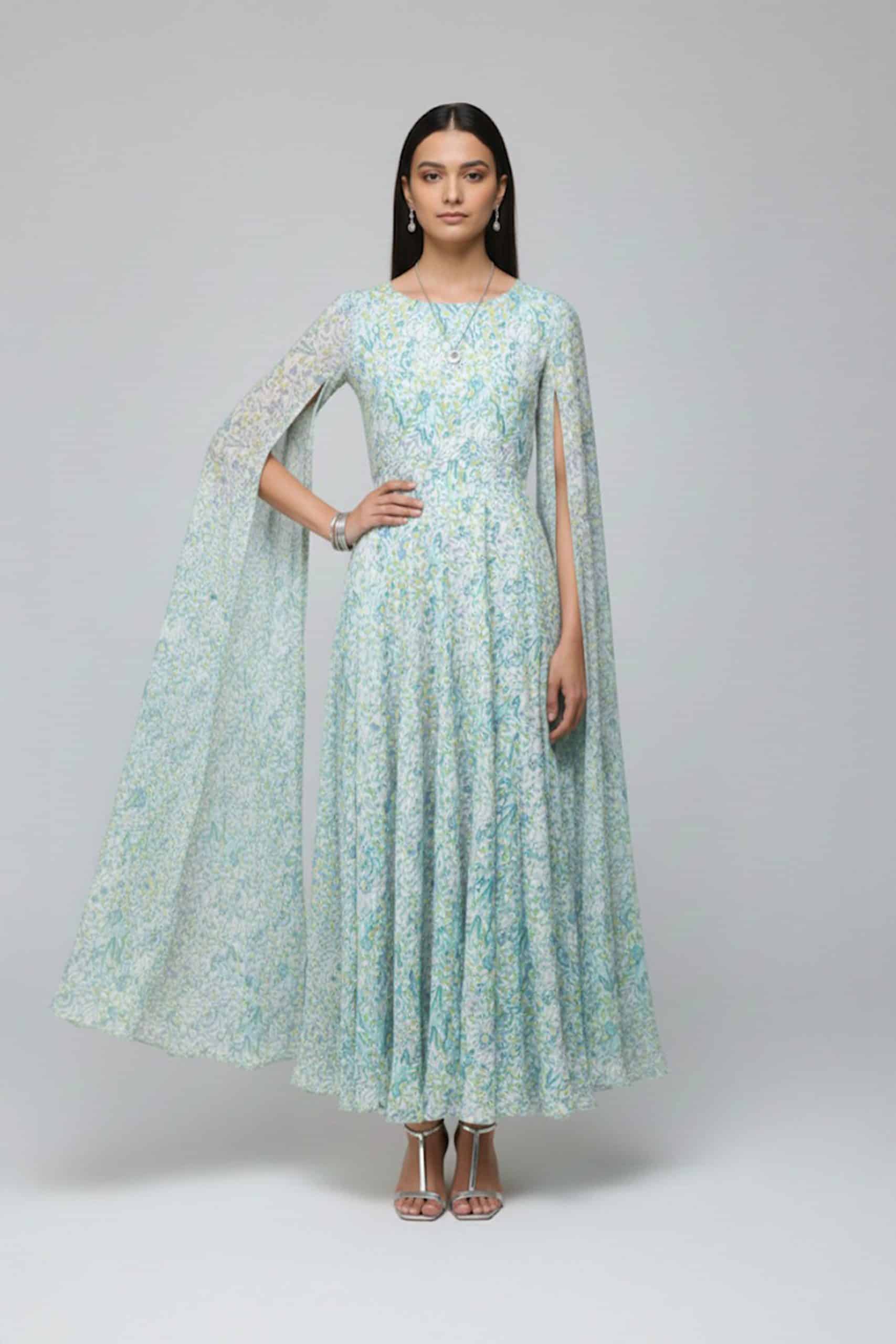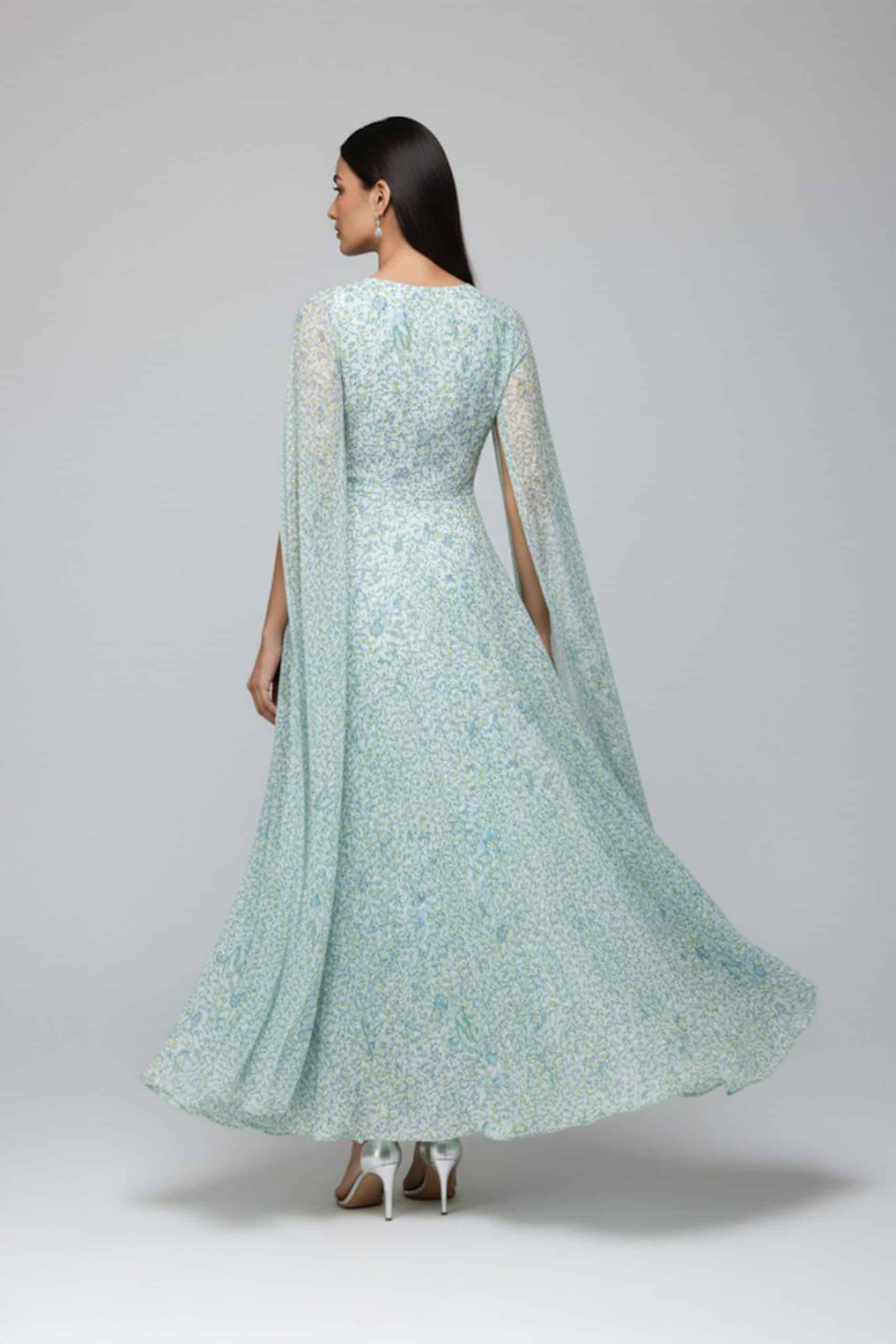 The Floral Cape Maxi Dress is a refined expression of effortless elegance, designed for women who appreciate fluid silhouettes and soft feminine detailing. Crafted in a soothing pastel mint palette with delicate floral prints, this statement piece blends contemporary structure with timeless grace. The flowing cape sleeves create beautiful movement, making this Floral Cape Maxi Dress ideal for festive gatherings, destination celebrations, and elegant evening occasions.