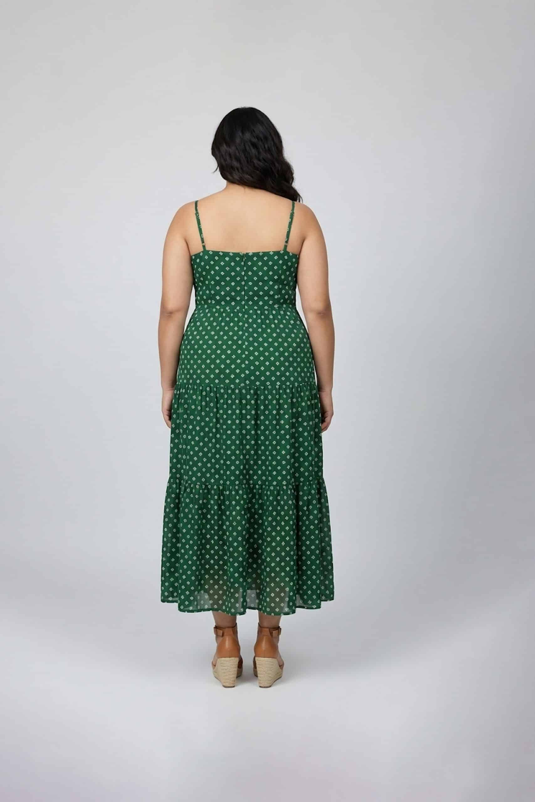 This green bandhani maxi dress offers comfort with timeless style. It suits women who prefer easy and graceful outfits. The tiered shape creates a soft flow and adds movement while walking.