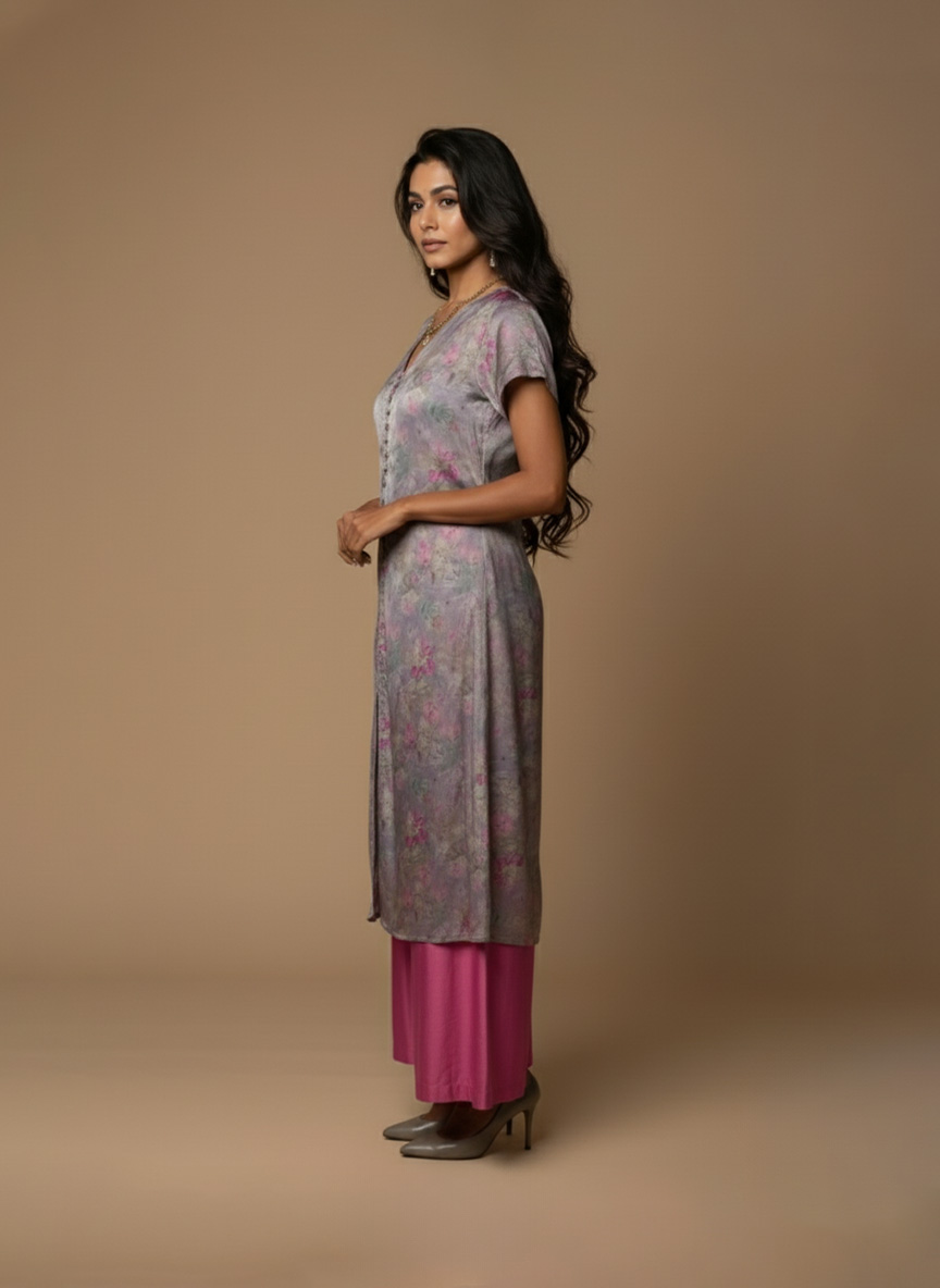 The V-neck kurta features delicate buttons down the front and short sleeves that keep the look minimal yet chic. The paired wide-leg pants offer comfort and movement, creating a perfect balance between structure and flow. Additionally, the outfit flatters all body types and gives a graceful drape. Therefore, this Grey pink floral kurta set can effortlessly take you from casual gatherings to small celebrations.
