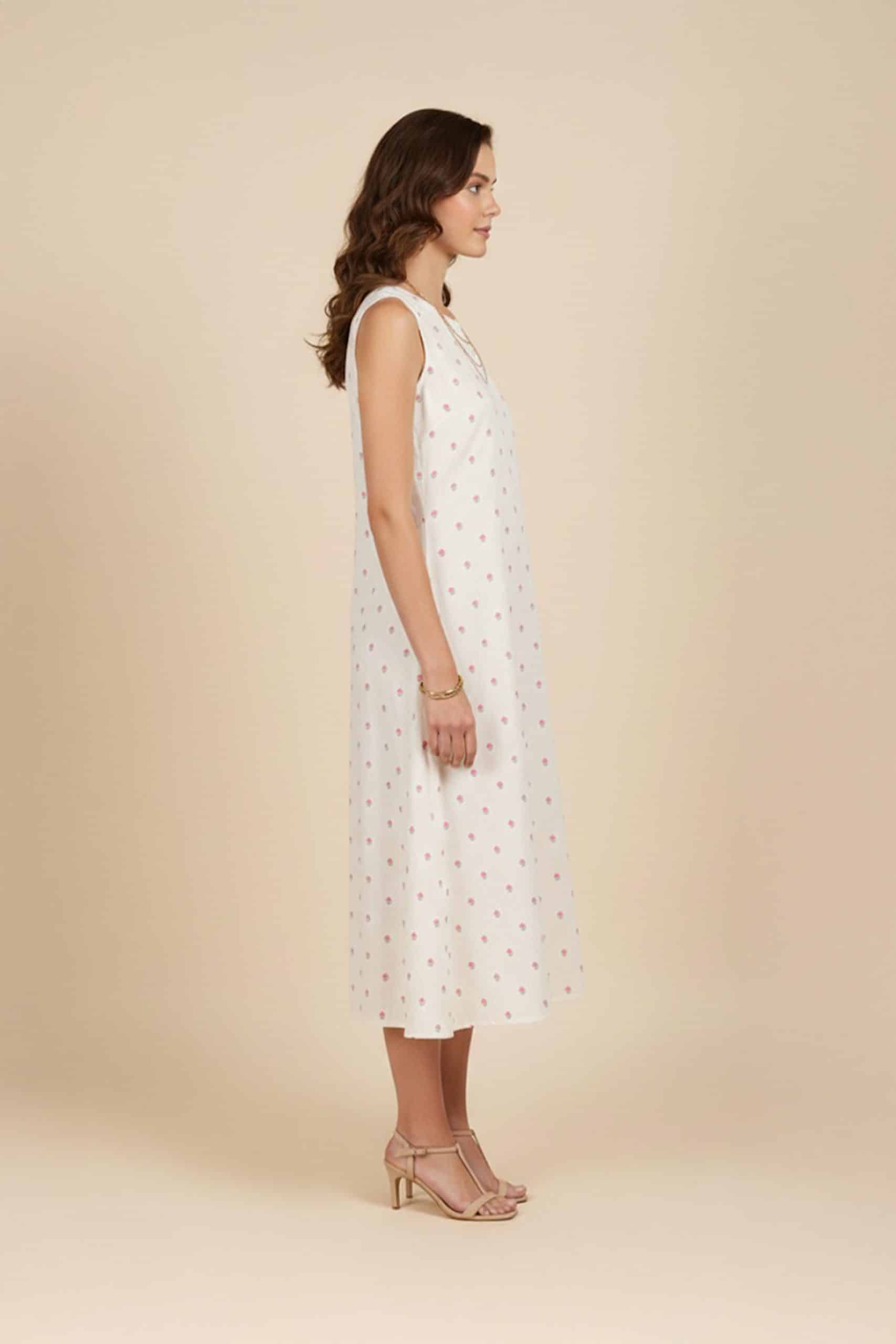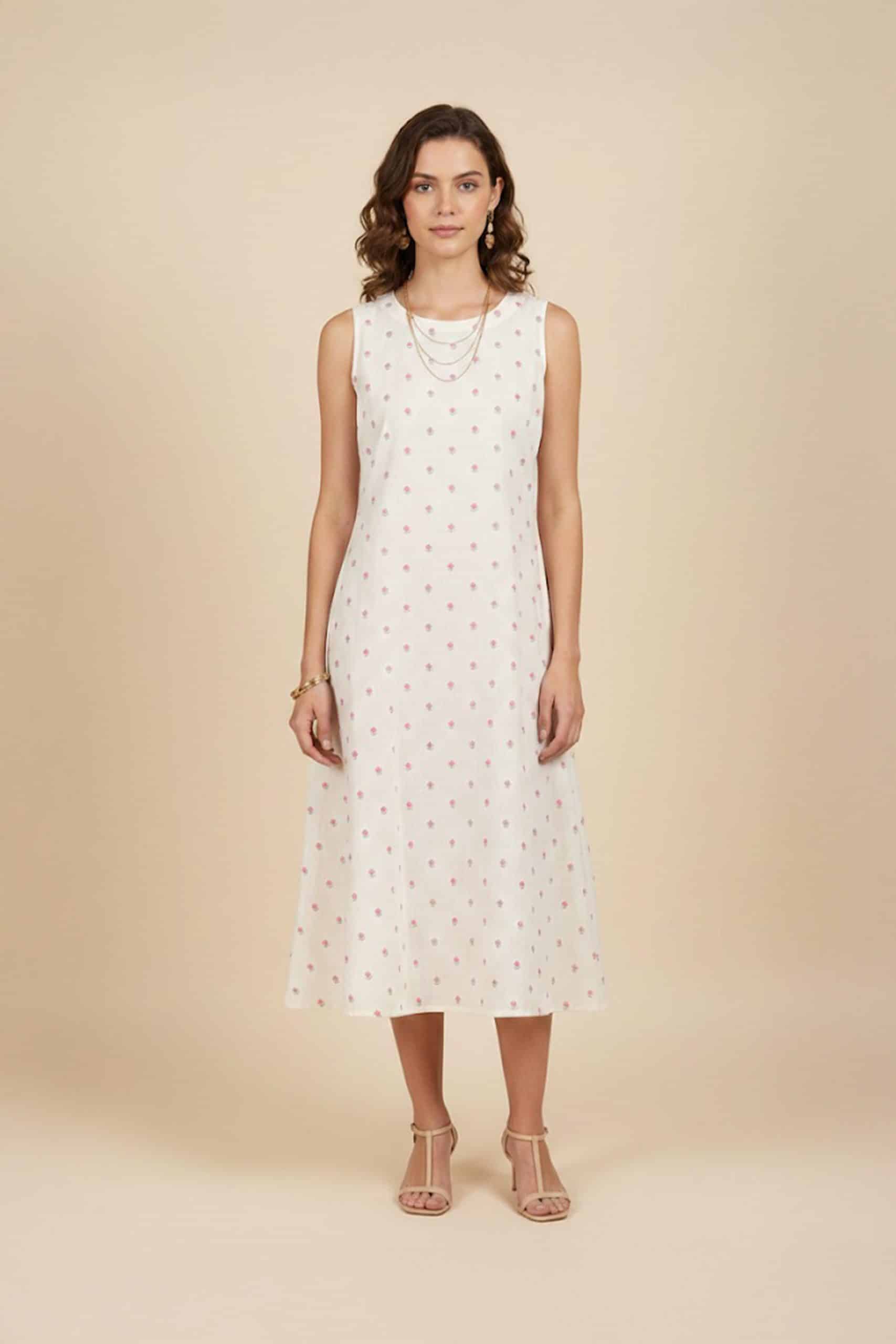 The sleeveless silhouette offers a clean and modern appeal, while the round neckline enhances its timeless design. Crafted from cotton, this ivory floral midi dress ensures all-day comfort, making it ideal for warm-weather styling. The gently flared A-line shape drapes beautifully over the body, creating a flattering and graceful fit.
