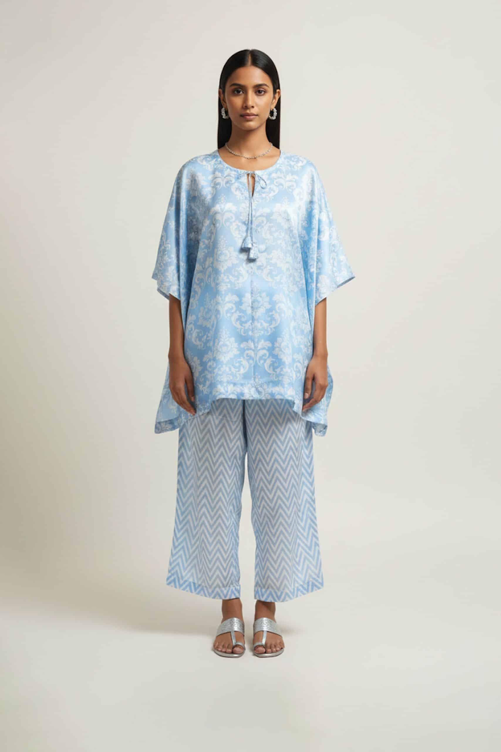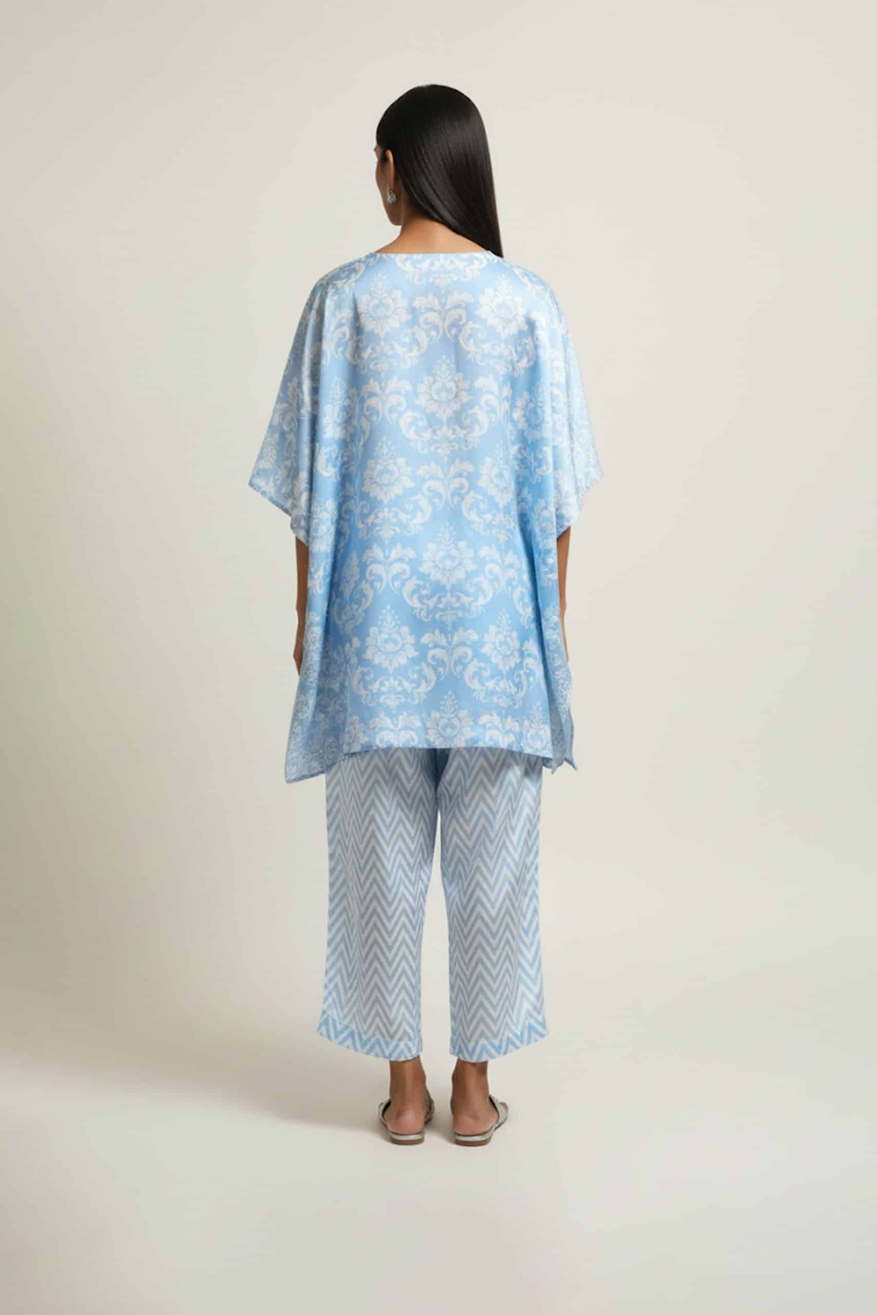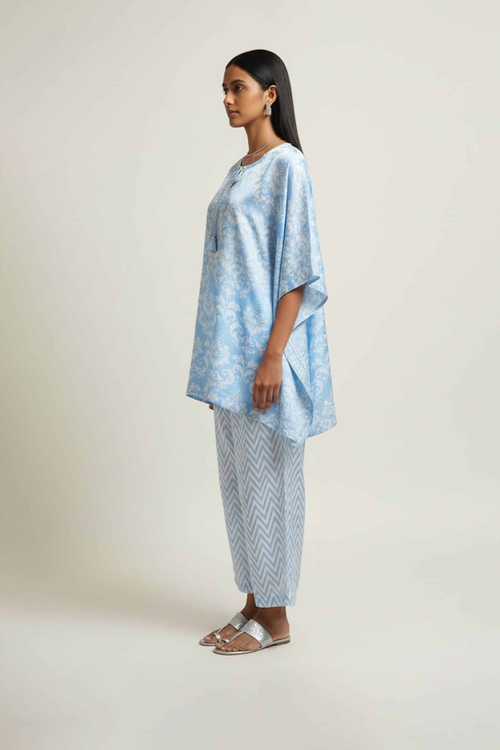 This light blue satin kaftan set is made from smooth, lightweight satin that feels soft on the skin. The kaftan-style kurta falls freely and does not cling to the body. As a result, it creates a flattering and relaxed shape. The neckline detail adds interest while keeping the design simple. In addition, the printed palazzo pants balance the look and allow easy movement.