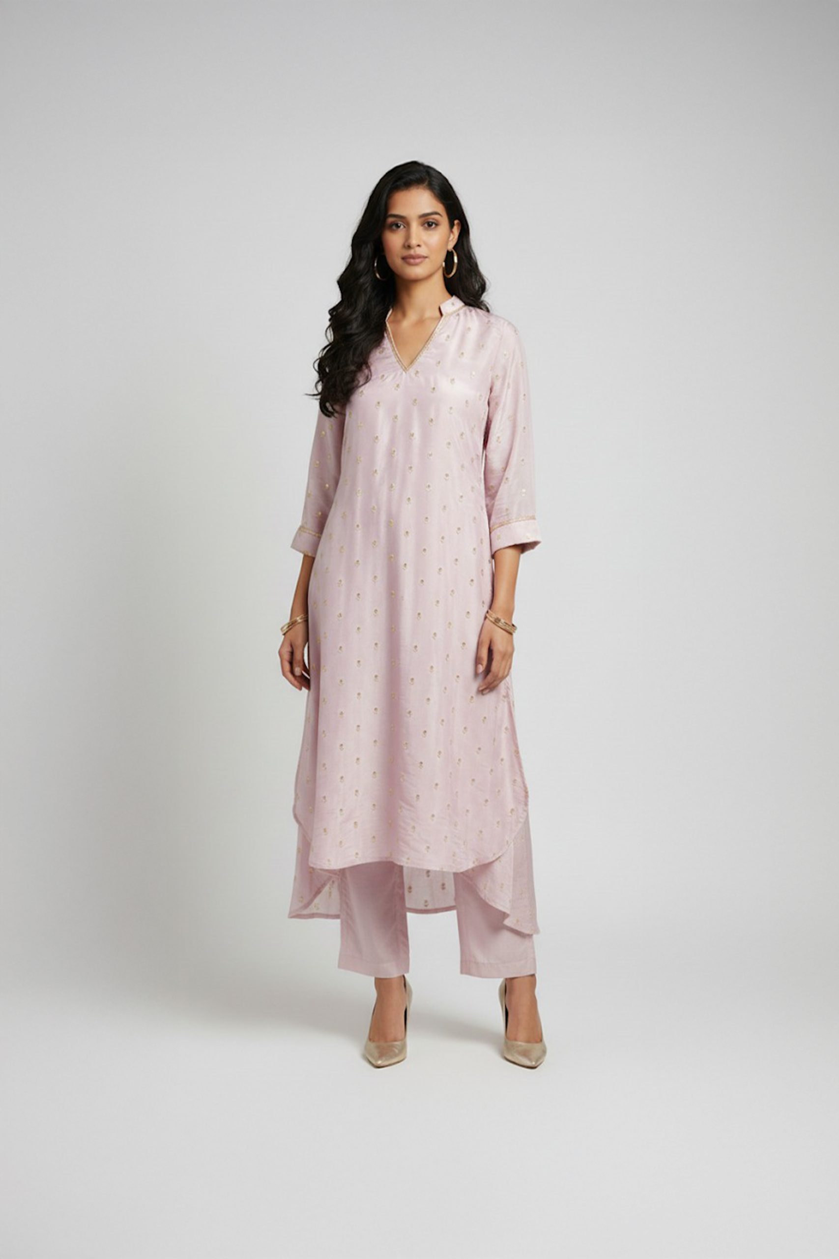 The kurti comes with matching pastel pink pants. So, you get a complete outfit. Also, the straight pants keep the look neat and simple.