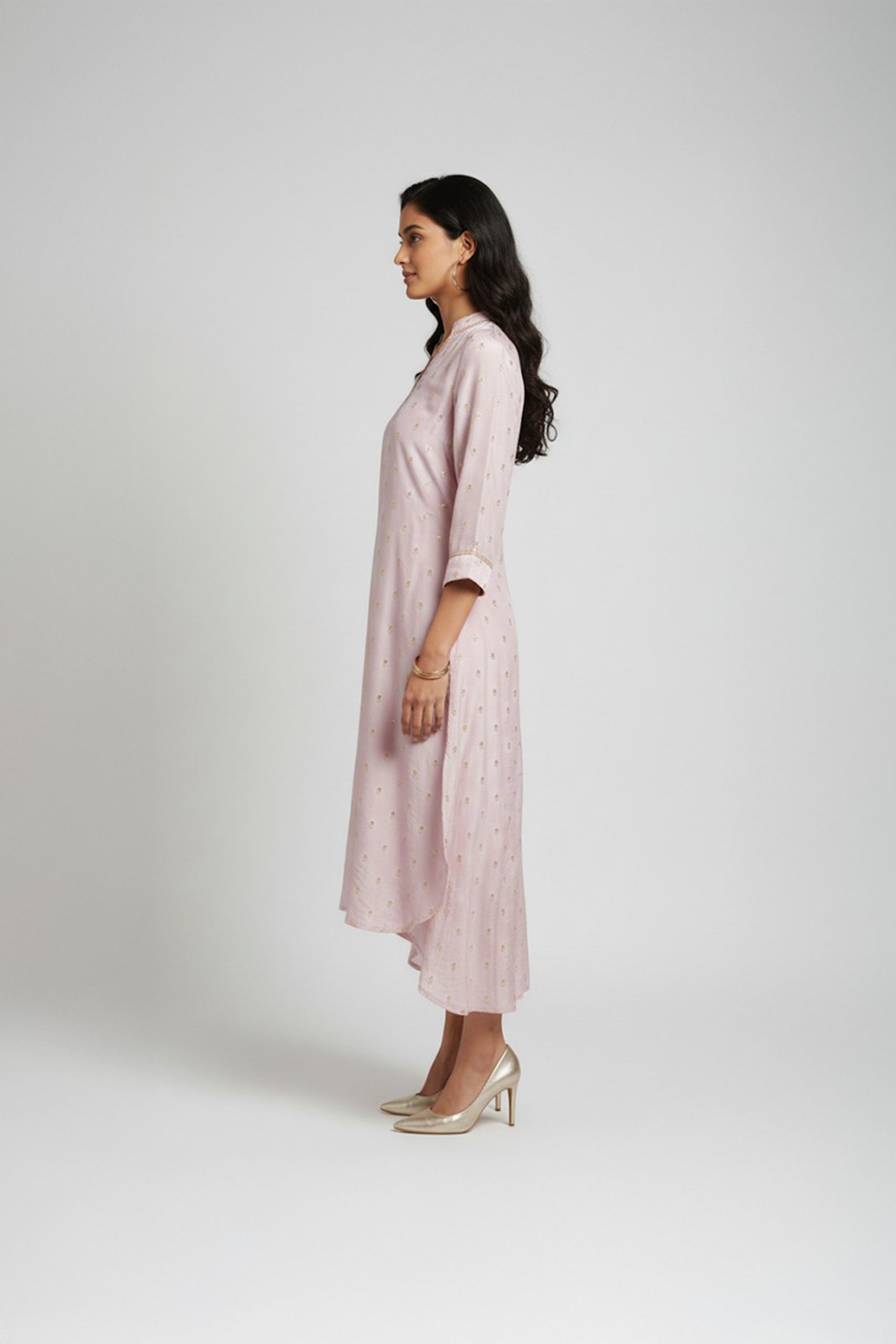 This pastel kurti set features a soft tone with a slight mauve feel. It looks calm and elegant. So, it suits daily wear and small events.