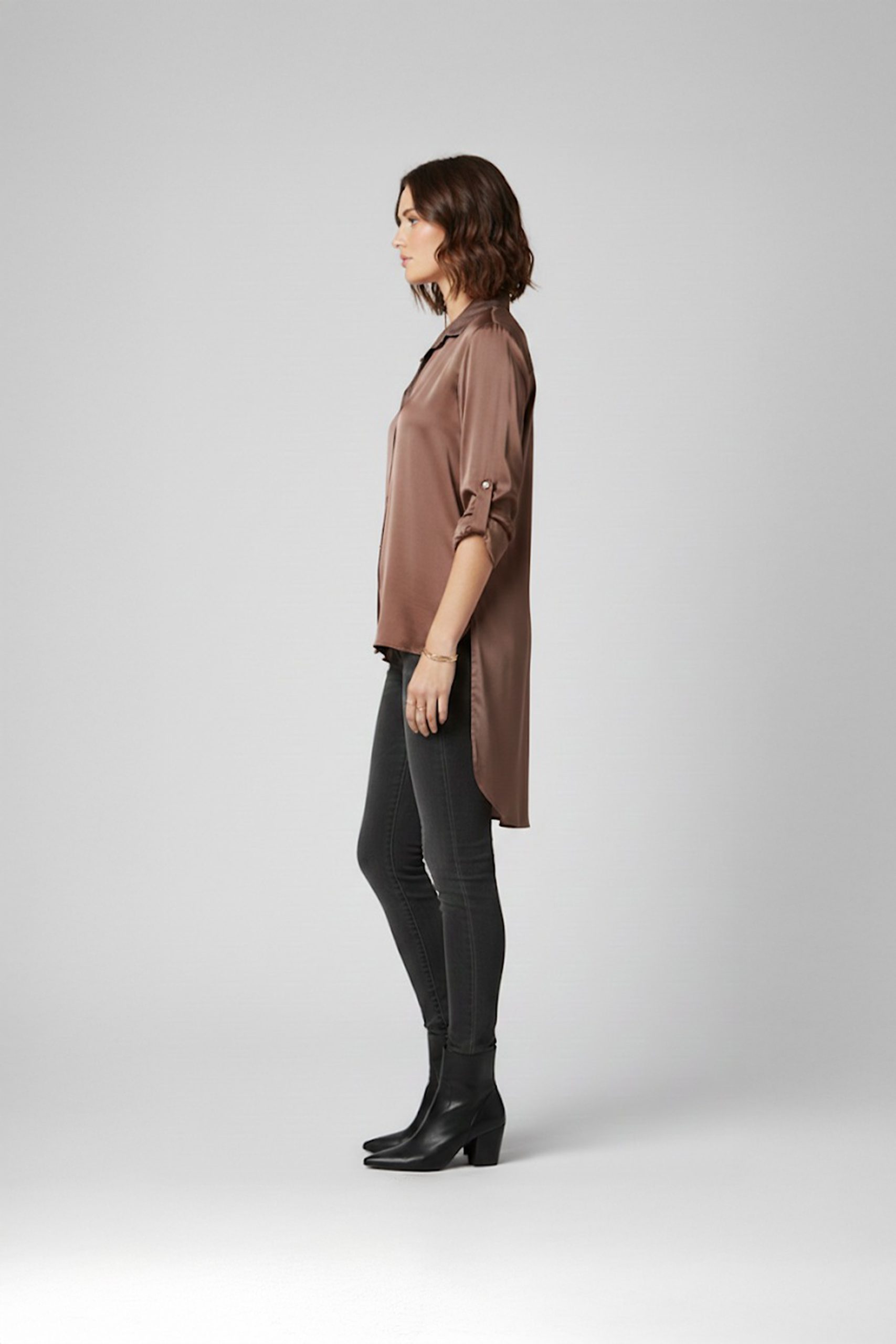 • Crafted from smooth satin with a classic collar and high-low hem.