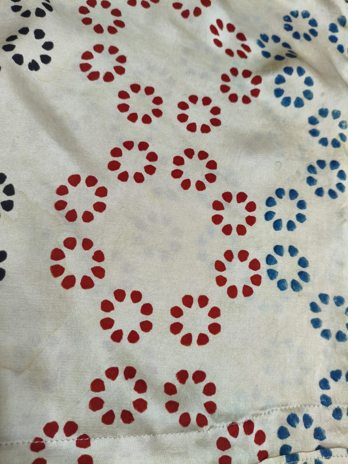 Color: White with red-blue floral + multicolor stripes