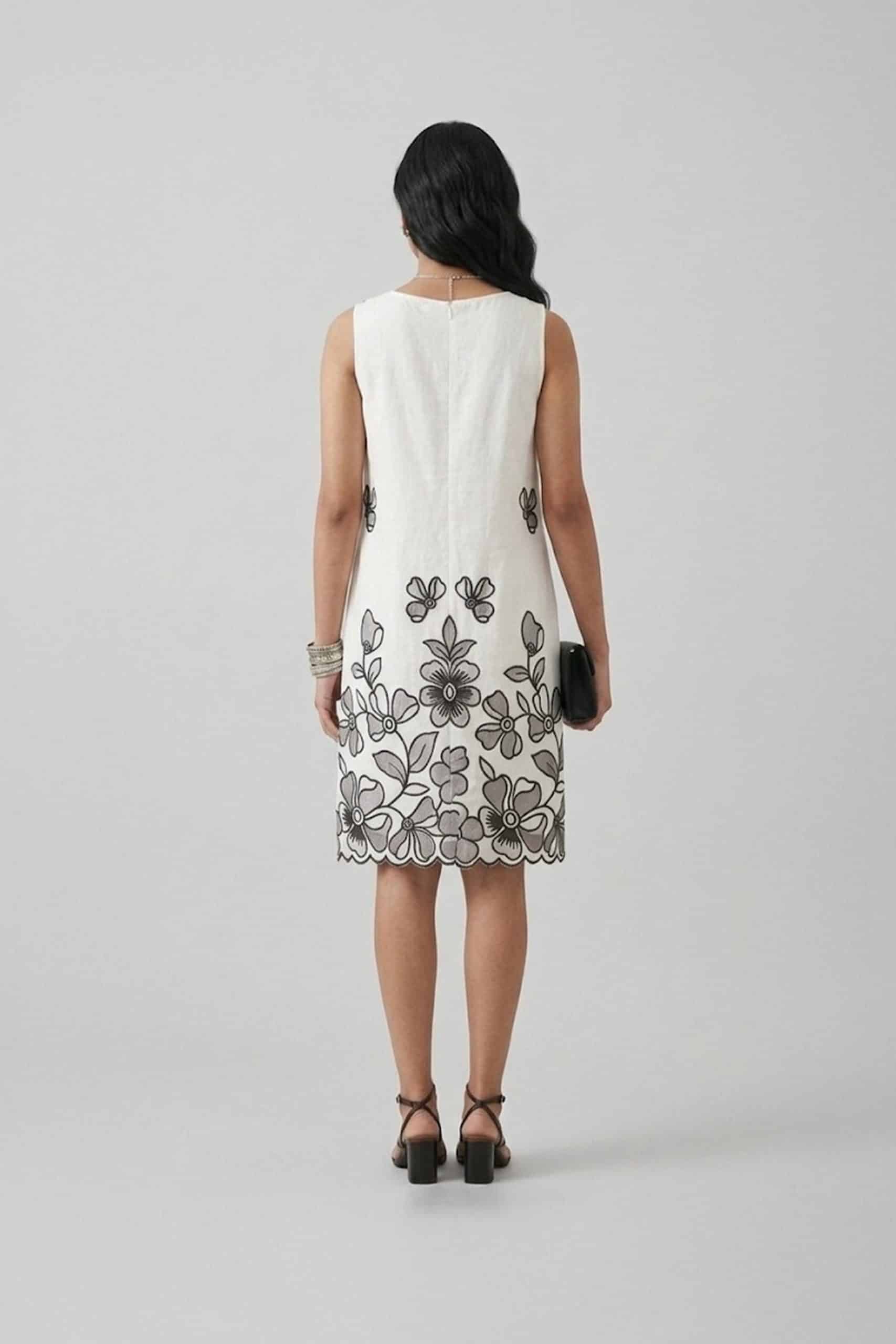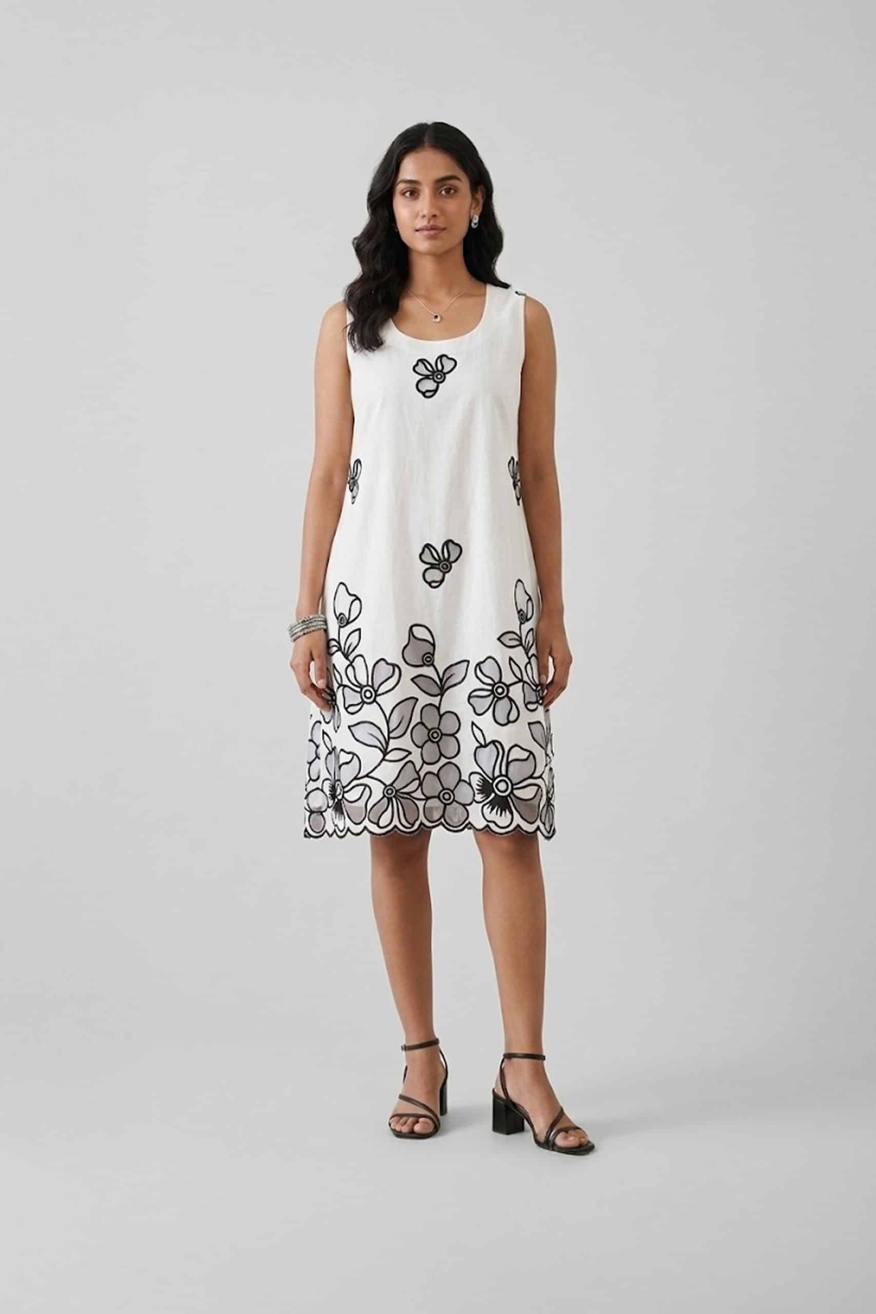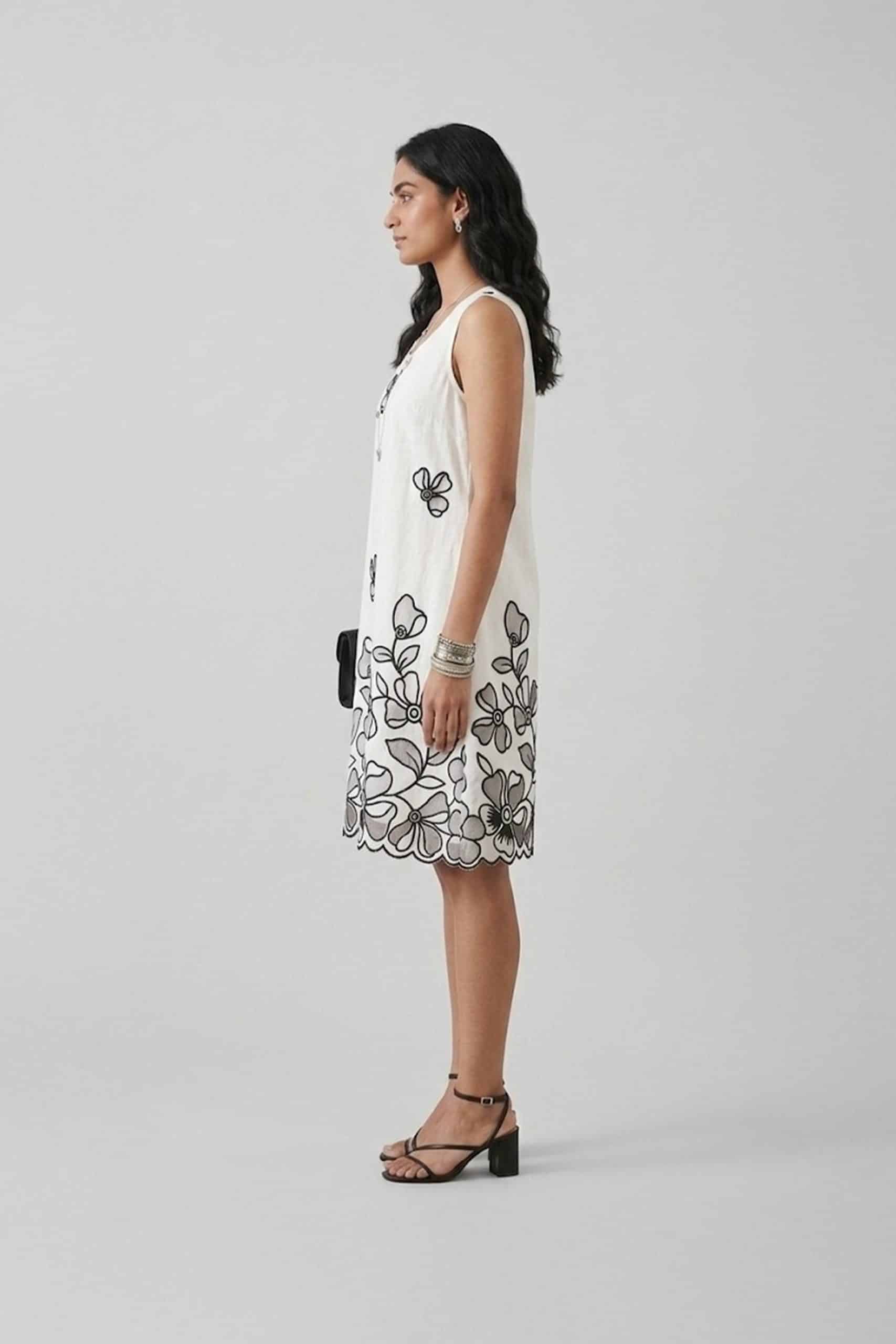 The White Floral Embroidered Dress from Ivory by Radhika is a beautiful summer essential that combines elegance with everyday comfort. This sleeveless dress features delicate black floral embroidery that stands out gracefully against the soft ivory base.