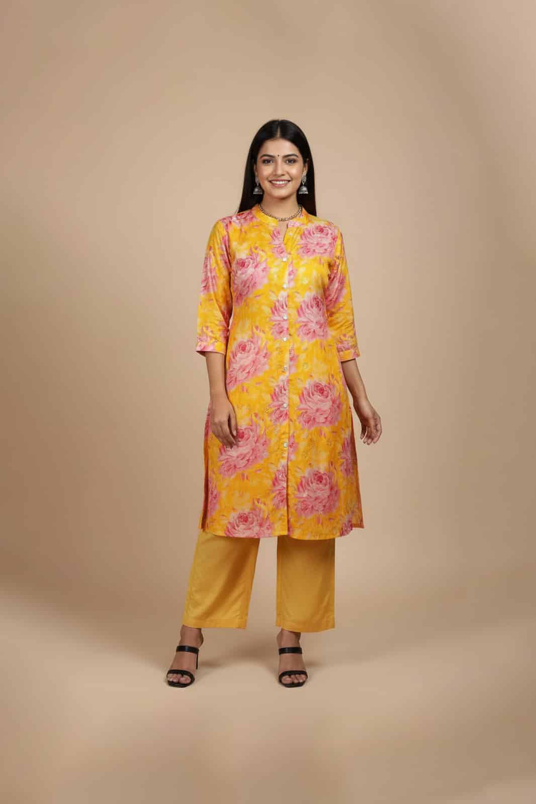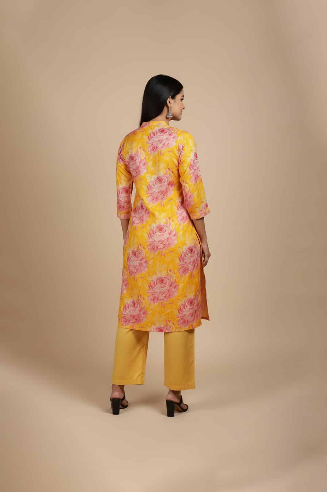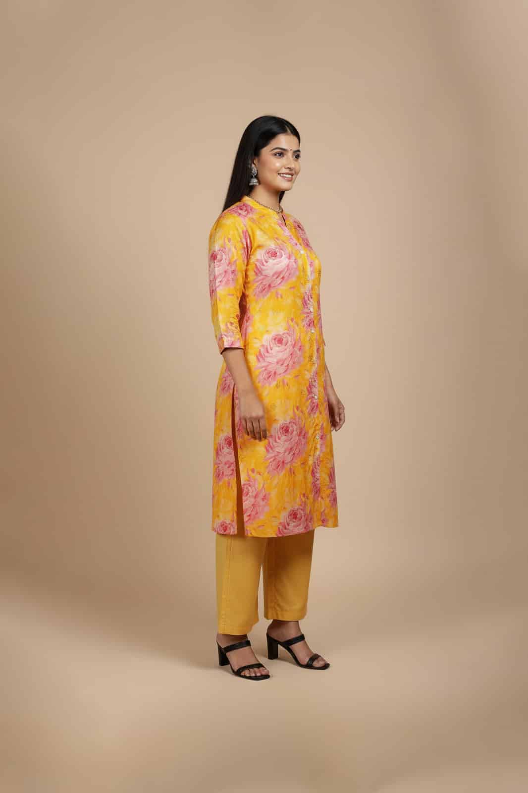Step into cheerful elegance with our yellow floral kurta for women, designed to lift your everyday style. The bright yellow base paired with beautiful pink floral prints creates a soft and feminine look that stands out with ease.